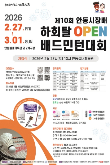 [뉴스노크=김인호 기자] 『제10회 안동시장배 하회탈 OPEN 배드민턴대회』가 오는 2월 27일부터 3월 1일까지 3일간 안동체육관과 안동다목적체육관에서 개최된다.
