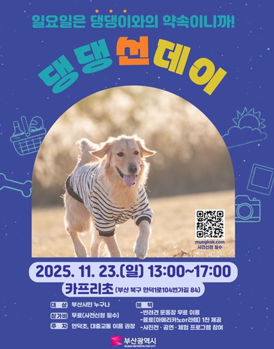 [뉴스노크=김인호 기자] 부산시는 오는 11월 23일 오후 1시부터 5시까지 카프리초(북구 만덕동 소재) 내 반려견 운동장에서 '댕댕 선데이(반려동물 동반 피크닉 체험 행사)'를 개최한다고 밝혔다.