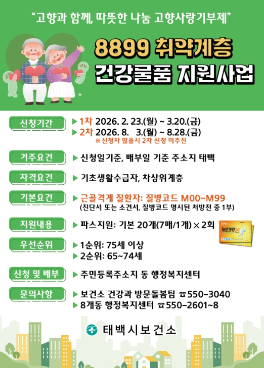 [뉴스노크=김인호 기자] 태백시는 고향사랑기금을 활용해 관절염 등 근골격계 질환으로 어려움을 겪는 관내 취약계층 어르신을 대상으로 『8899 취약계층 건강물품 지원사업』을 추진한다고 밝혔다.