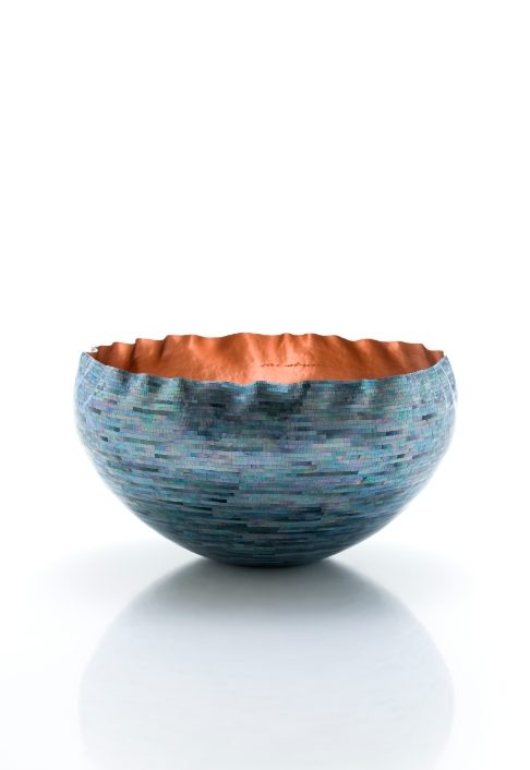 'Blue Wave No.5'는 한국 전통 자개 공예의 ‘끊음질’ 기법을 현대적으로 확장한 작품으로, 금속 기형 위에 자개를 한 조각씩 붙여 밀도 높은 표면을 구축한 것이 특징이다.