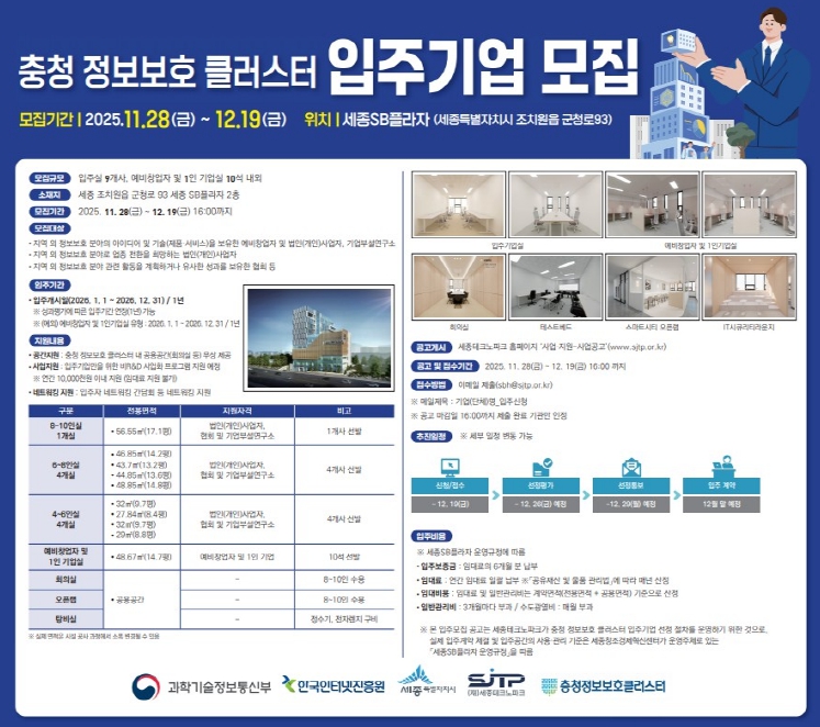 충청 정보보호 클러스터는 세종 조치원읍 군청로 93 세종SB플라자에 구축되는 정보보호 특화 공간으로, 정보보호 기술·제품·서비스를 보유한 기업, 정보보호 분야로 전환을 준비하는 기업, 예비창업자 등을 대상으로 한다.