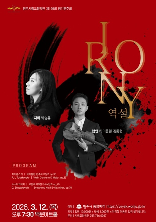 [뉴스노크=김인호 기자] 원주시립교향악단은 다음 달 12일 오후 7시 30분 백운아트홀에서 제199회 정기연주회 ‘IRONY 역설’을 개최한다.