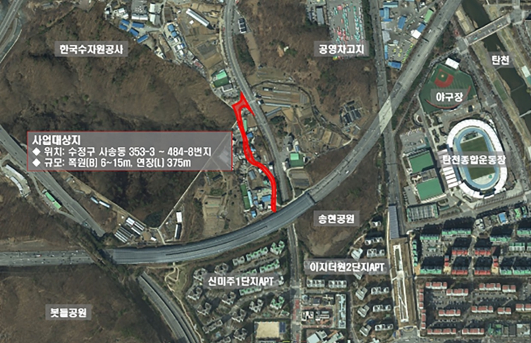 | ▲ 375m길이의 도로가 개설되는 성남시 수정구 사송동 353-3번지∼484-8번지 위치도 |