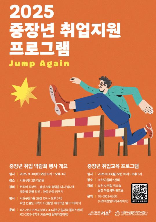 [뉴스노크=김인호 기자] 서울 서초구는 중장년의 구직 활동을 응원하기 위해 오는 30일 취업지원 프로그램 ‘점프 어게인(JUMP AGAIN)’을 개최한다고 밝혔다.