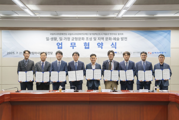 한전이 속한 ‘빛가람혁신도시 저출생 현안대응 협의회’(이하 협의회)와 문화전당/재단은 7월 21(월) 광주광역시 동구에 위치한 국립아시아문화전당에서 임직원 문화 향유 기회 확대와 지역 문화예술 발전을 도모하기 위한 업무협약을 체결했다. 협약식에는 안중은 한전 경영관리부사장과 김상욱 국립아시아문화전당장, 김명규 문화전당재단 사장 등이 참석했다
