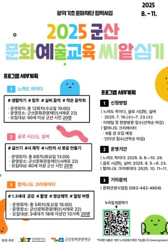 [뉴스노크=김인호 기자] 군산문화관광재단이 2025년 광역-기초문화재단 협력사업인 [군산 문화예술교육 씨-앝(art) 심기]의 참여자를 모집한다.