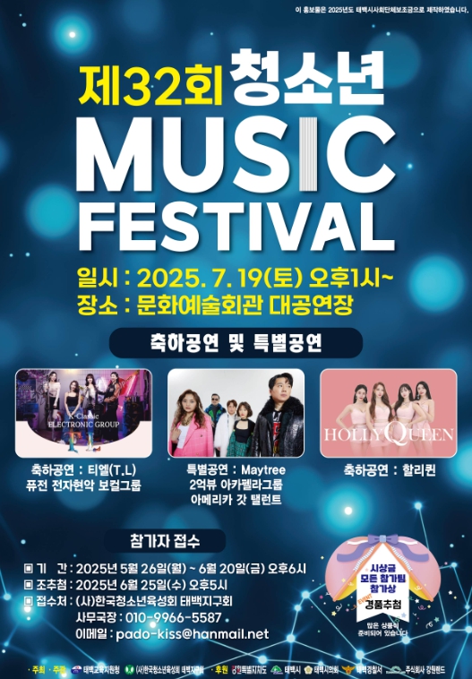 [뉴스노크=김인호 기자] 태백시는 오는 7월 19일 토요일 오후 1시부터 4시까지 문화예술회관 대공연장에서 ‘제32회 청소년 뮤직페스티벌’을 개최한다고 밝혔다.
