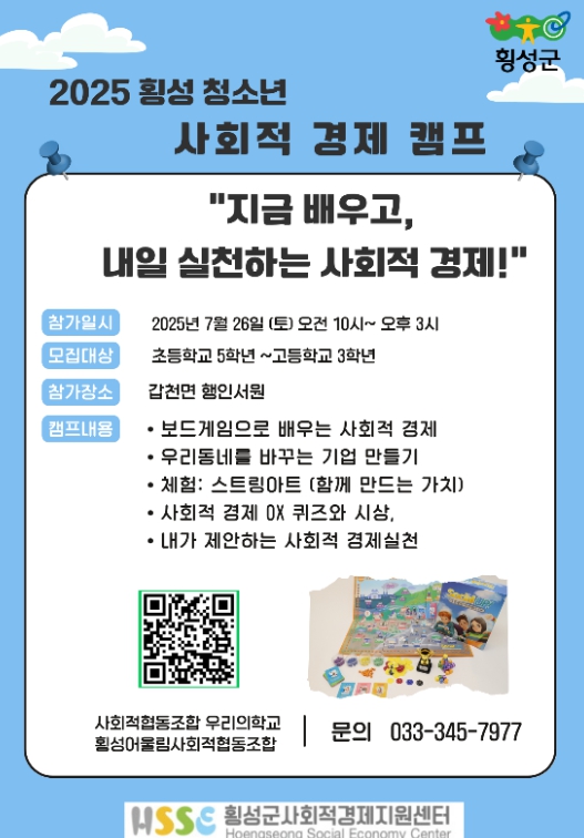 ‘2025 횡성 청소년 사회적경제 캠프’는 오는 7월 26일 갑천면 행인서원에서 개최되며, 초등학교 5학년부터 고등학교 3학년까지 청소년 20명을 대상으로 운영된다.
