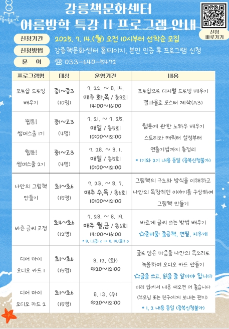 수강생은 강릉책문화센터 누리집을 통해 오는 7월 14일(월) 오전 10시부터 선착순으로 모집한다.