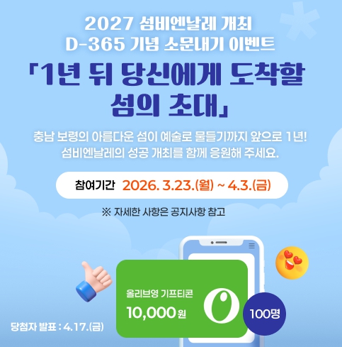 한편 국내 최초로 섬을 주제로 열리는 섬비엔날레는 2027년 4월 3일부터 약 두 달간 충남 보령의 원산도와 고대도를 무대로 24개국 작가들의 다양한 예술 작품들을 선보일 예정이다.