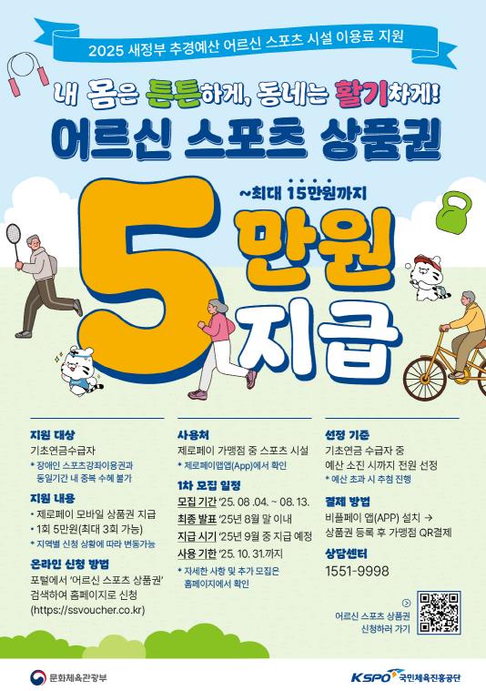 또한, 대상자로 선정되면 2025년 10월 31일까지 1회 5만 원(최대 3회 가능)의 스포츠 시설 이용료를 지원받게 된다.