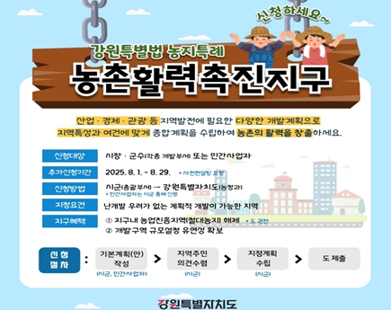강원특별자치도는 개정된 조례 기준을 적용한 ‘농촌활력촉진지구 관리 지침’을 시군에 통보하고, 오는 8월 1일부터 29일까지 2차 촉진지구 추가신청 접수를 받는다.