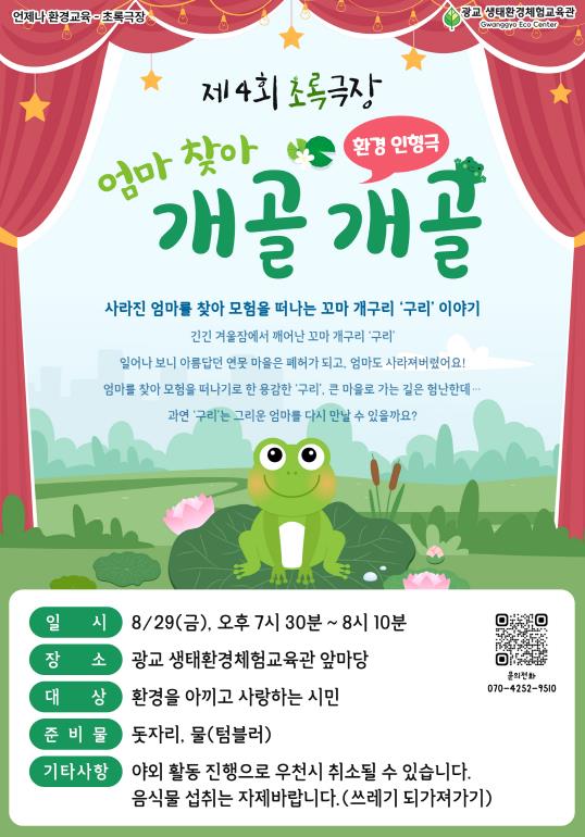 인형극 ‘엄마 찾아 개골개골’을 상연한다. 도시 개발로 사라져가는 개구리 서식지를 배경으로 길을 잃은 아기 개구리가 엄마를 찾아가는 여정을 담았다. 자연 생태계의 균형과 생명의 소중함을 이해할 수 있는 작품이다.
