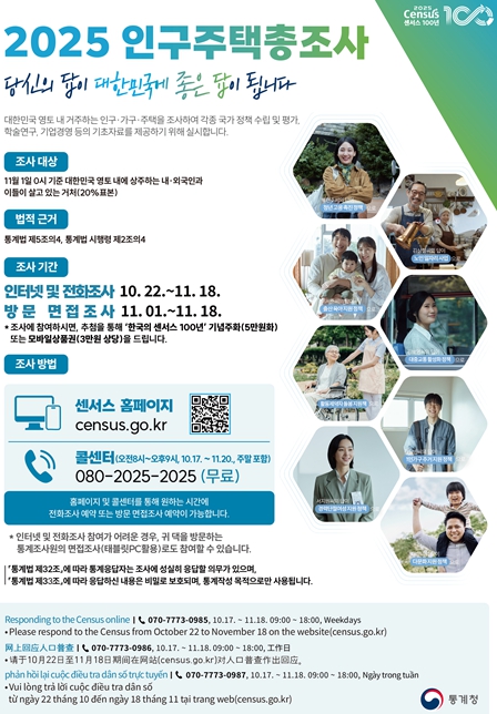 배명숙 김해시 스마트도시과장은 “2025 인구주택총조사는 통계 작성 100주년을 맞는 뜻깊은 조사로, 김해시의 미래 정책 수립에도 중요한 자료가 될 것”이라며 “조사원이 방문할 경우 적극적인 협조를 부탁드리며, 가급적 인터넷·전화 조사로 참여해 주시길 바란다”고 말했다.