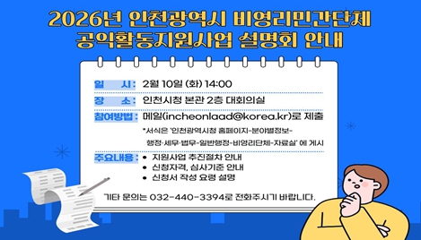 이번 설명회는 인천시에 등록된 비영리민간단체 중 '2026년 인천광역시 비영리민간단체 공익활동 지원사업'에 참여를 희망하는 단체를 대상으로 인천시청 본관 2층 대회의실에서 진행된다.