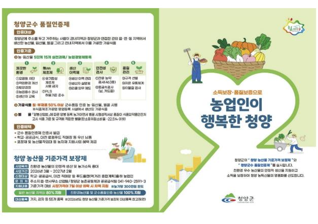 기준가격 보장제 신청 대상은 청양군에 주소를 두고, 푸드플랜 관계시장(학교·공공급식, 직매장)에 농산물을 출하하는 농업인이다. 신청은 지난 21일부터 시작됐으며 오는 2월 20일까지 가능하다. 읍·면사무소 산업팀에서 접수할 수 있다.