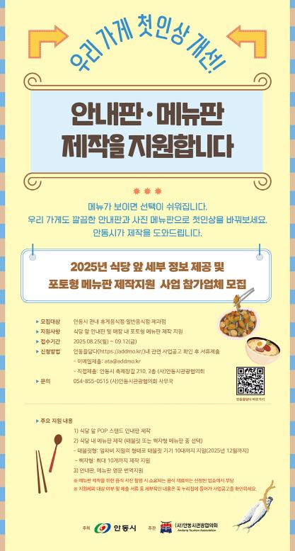 [뉴스노크=김인호 기자] 안동시와 (사)안동시관광협의회는 8월 25일부터 9월 12일까지 ‘2025년 식당 앞 세부정보 제공 및 포토형 메뉴판 제작지원 사업’ 참가업체를 모집한다.