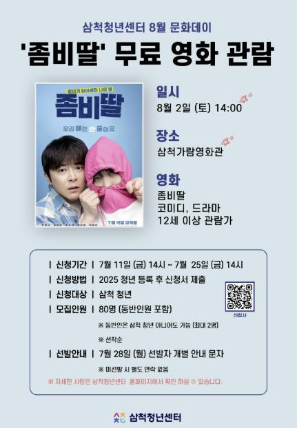 [뉴스노크=김인호 기자] 삼척청년센터가 오는 8월 2일 오후 2시, 삼척가람영화관에서 청년들을 위한 특별한 문화데이를 진행한다. 이번 행사에서는 가족 코미디 영화 ‘좀비가 되어버린 나의 딸’ (약칭 ‘좀비딸’)을 상영하며, 무더운 여름철 청년들에게 웃음과 감동을 선사할 예정이다.