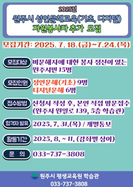 [뉴스노크=김인호 기자] 원주시 평생교육원 학습관은 7월 18일부터 24일까지 성인문해교육 자원봉사자 15명(기초 9명, 디지털 6명)을 모집한다.