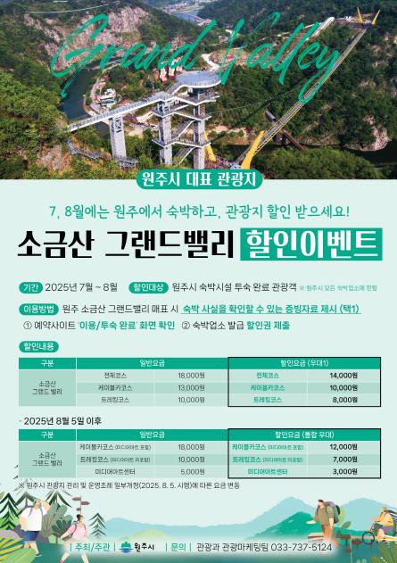 [뉴스노크=김인호 기자] 원주시는 7·8월 피서철을 맞아 ‘소금산그랜드밸리 할인 이벤트’를 진행한다.