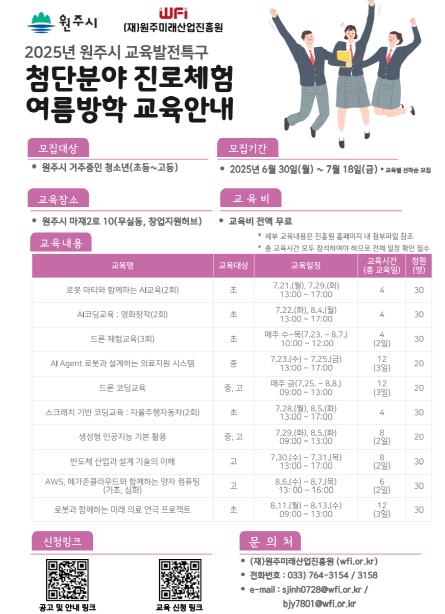 [뉴스노크=김인호 기자] 원주시는 2025년 교육발전특구 사업의 일환으로, (재)원주미래산업진흥원과 함께 여름방학 기간 지역 초·중·고등학생을 위한 ‘첨단분야 진로체험 교육 프로그램’을 전액 무료로 운영한다.