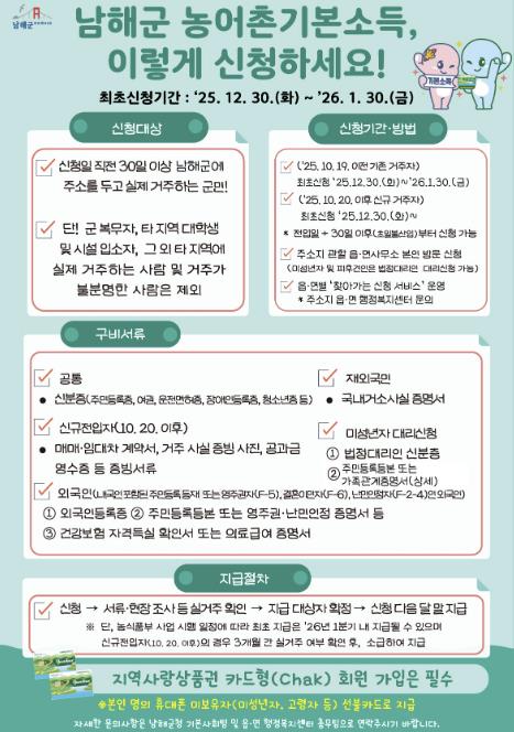 [뉴스노크=김인호 기자] 남해군은 ‘농어촌 기본소득 시범사업’ 신청 접수를 오는 12월 30일부터 2026년 1월 30일까지 실시한다고 밝혔다.