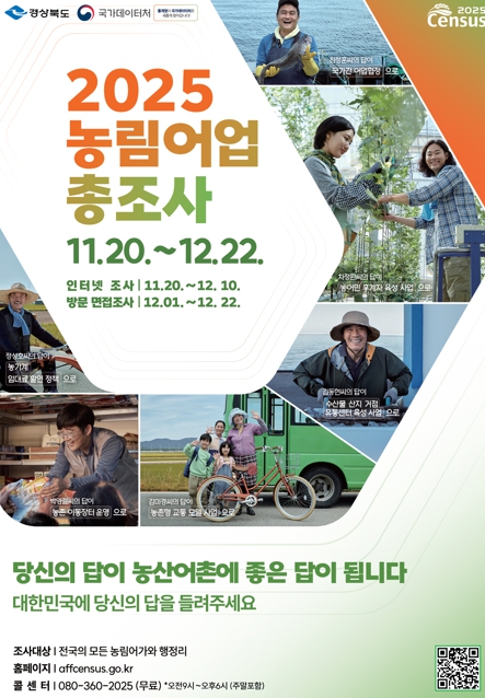 [뉴스노크=김인호 기자] 경상북도는 11월 20일부터 12월 22일까지 도내 모든 농가·임가·어가와 읍면지역의 행정리를 대상*으로 ‘2025년 농림어업총조사’를 실시한다.