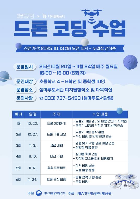 [뉴스노크=김인호 기자] 원주시 샘마루도서관은 과학기술정보통신부가 주최하고 한국지능 정보사회진흥원에서 주관하는 ‘디지털 역량 강화 교육: 드론 코딩 수업’을 10월 20일부터 11월 24일까지 운영한다.