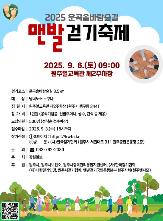 전국 맨발걷기 동호인들의 한마당 축제로 진행되는 이번 행사는 강원일보사가 주최하고 원주시, 원주시보건소, 원주시중독관리통합지원센터, (사)한국걷기협회, (재)대한걷기연맹, 원주시걷기협회, 맨발걷기국민운동본부 원주지회(원주맨사모)가 공동 후원한다.