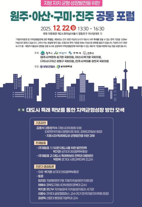 이 자리는 특별법 개정을 촉구하기 위한 4개 지자체 공동 포럼으로 대도시 특례 확보를 통한 지역균형성장 방안을 모색하기 위해 마련됐다. 포럼은 김중석 대통령 직속 지방시대위원회 위원의 기조 강연을 시작으로 박기관 상지대학교 부총장, 경기대 박현욱 교수의 주제 발표 후 전문가들의 토론을 진행한다.