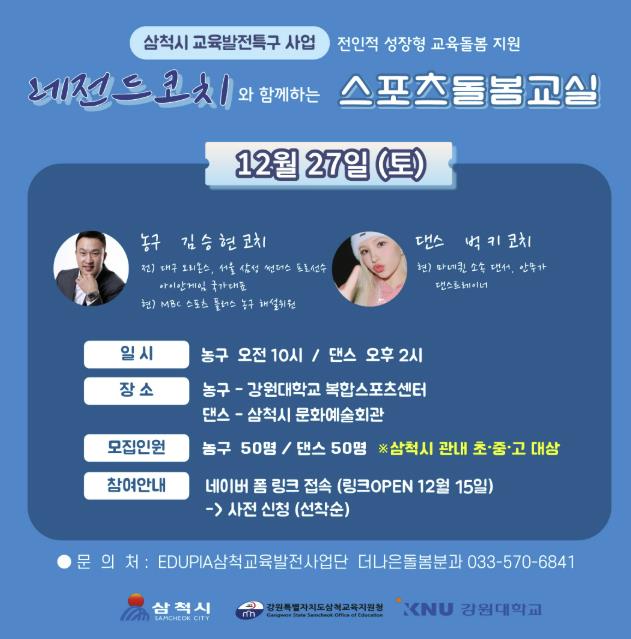 삼척시는 이 열기를 이어 오는 12월 27일(토)에 농구와 댄스 종목의 스포츠돌봄교실을 운영한다. 농구 교실은 ‘매직 핸드’로 불리는 김승현 코치가 강원대학교 복합스포츠센터에서 오전 10시부터 12시까지 진행하며, 기초 동작과 전술 이해, 실습 및 협동 활동을 지도할 예정이다.