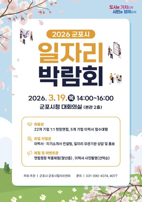 [뉴스노크=김인호 기자] 군포시는 오는 3월 19일 오후 2시부터 시청 대회의실에서 ‘2026년 군포시 일자리 박람회’를 개최한다. 이번 박람회는 지역 내 우수 기업과 구직자가 직접 만나는 채용의 장으로 제조, 서비스, 물류배송, 의료복지 등 다양한 분야에서 폭넓은 취업 기회를 제공할 예정이다.