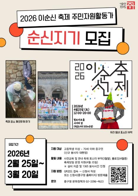 [뉴스노크=김인호 기자] 이순신 장군의 탄생지 서울 중구가 4월에 있을 <2026 이순신 축제>에서 활약할 주민자원활동가 ‘순신지기’와 ‘중구 소년 이순신’을 선발한다.