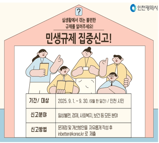 [뉴스노크=김인호 기자] 인천광역시는 시민들이 체감하는 생활 속 불편을 해소하고 지역 경제 활성화를 도모하기 위해 오는 9월 한 달간 민생규제 집중신고기간을 운영한다고 29일 밝혔다.