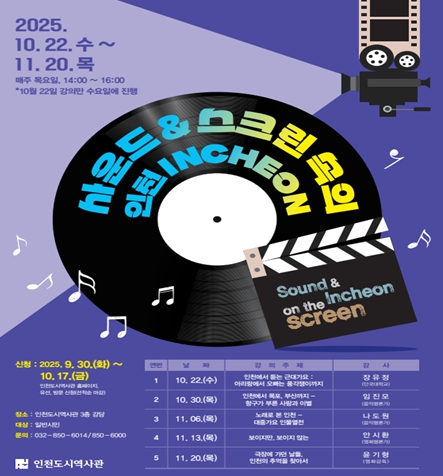 [뉴스노크=김인호 기자] 인천광역시 인천도시역사관은 오는 10월 22일부터 일반 시민을 대상으로 ‘도시학당-사운드&스크린 속의 인천’을 운영한다고 밝혔다.