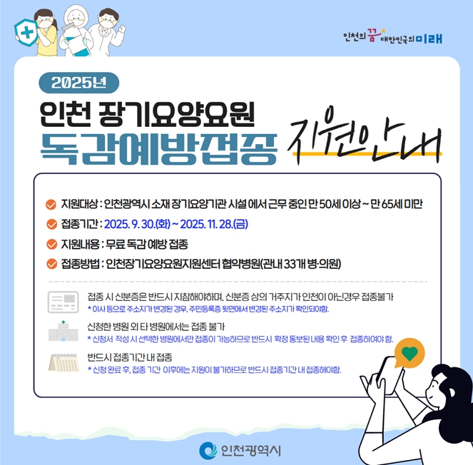 [뉴스노크=김인호 기자] 인천광역시는 노인 감염취약시설인 장기요양기관 종사자 1만여 명의 건강권 확보와 처우 개선을 위해 오는 9월 30일부터 11월 28일까지 약 9주간 무료 독감 예방접종을 실시한다고 밝혔다.