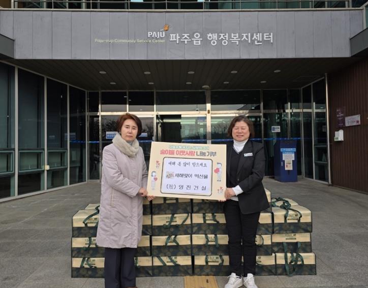 [뉴스노크=김인호 기자] 파주시 파주읍은 지난 26일 영진건설㈜이 파주읍 행정복지센터를 방문해 지역 내 어려운 이웃들에게 따뜻한 사랑을 나누고자 떡 선물 꾸러미 40상자(200만 원 상당)를 기탁했다고 전했다.