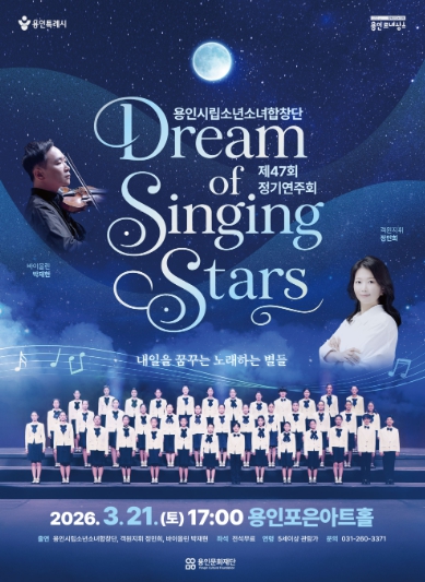 [뉴스노크=김인호 기자] 용인문화재단은 오는 3월 21일 용인포은아트홀에서 용인시립소년소녀합창단 제47회 정기연주회'Dream of Singing Stars'를 개최한다고 밝혔다.