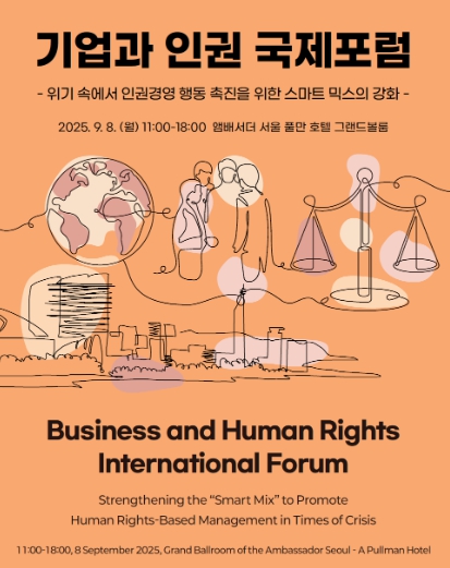 [뉴스노크=김인호 기자] 법무부와 국가인권위원회는 2025년 9월 8일 11:00부터 18:00까지 서울 중구 앰배서더 서울 풀만 호텔 그랜드볼룸에서 '기업과 인권 국제포럼'을 공동 개최한다고 밝혔다.