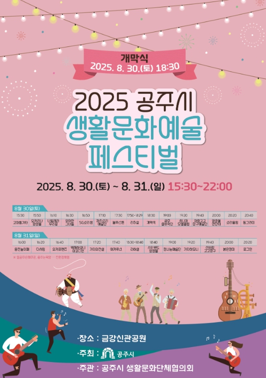 [뉴스노크=김인호 기자] 공주시는 공주시 생활문화단체협의회와 함께 ‘2025 공주시 생활문화예술 축제’를 오는 8월 30일과 31일 이틀간 금강신관공원에서 연다고 밝혔다.