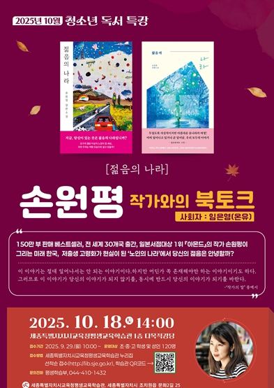[뉴스노크=김인호 기자] 세종특별자치시교육청평생교육학습관이오는 10월 18일 14시, 소설가이자 영화감독인 손원평 작가를 초청해 책마당(북콘서트)를 개최한다.