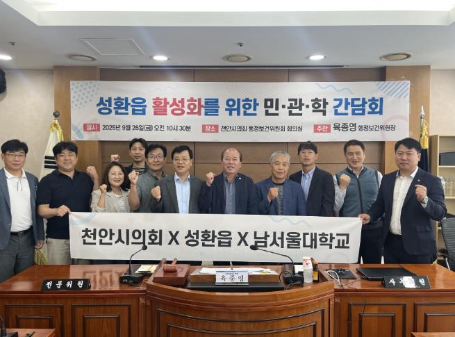 [뉴스노크=김인호 기자] 천안시의회 육종영 행정보건위원장은 26일 ‘성환읍 활성화를 위한 민·관·학 간담회’를 주재하고, 성환 도시재생혁신지구 지정 이후의 현황과 발전 전략을 공유하는 한편 지역대학 연계 사업과 민·관·학 거버넌스 강화 방안을 논의했다.