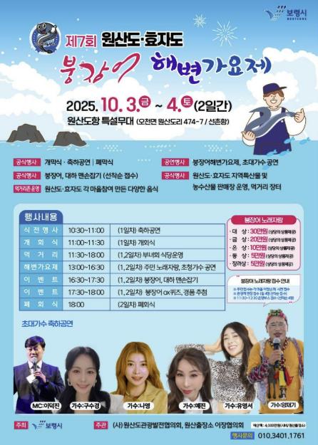 [뉴스노크=김인호 기자] 보령시가 주최하고 (사)원산도관광발전협의회가 주관하는 ‘제7회 원산도·효자도 붕장어 해변가요제’가 오는 10월 3일부터 4일까지 2일간 원산도항 특설무대에서 개최된다.