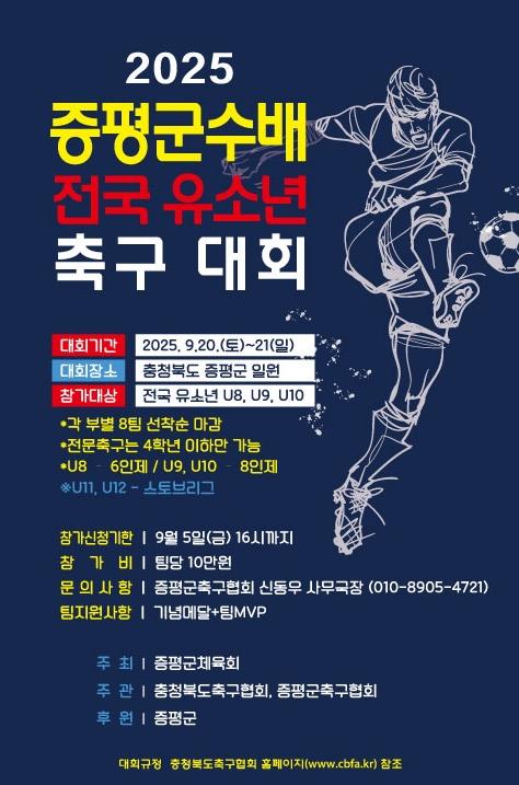 대회는 19일 오후 4시부터 8시까지 증평종합운동장에서 열리는 U11ㆍU12 스토브리그를 시작으로, 21일까지 증평대교 잔디구장에서 U9ㆍU10, 증평풋살경기장에서 U8 대회가 이어진다.