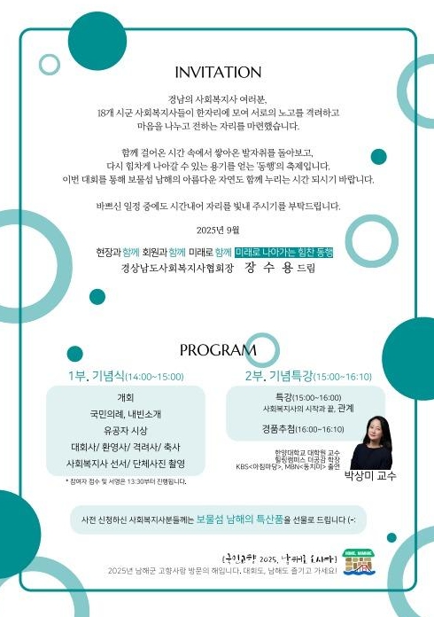 남해군과 경상남도사회복지사협회가 주최하고, 경남사회복지사협회가 주관하는이번 대회에는 현장의 최일선에서 이웃의 울타리 역할을 해 온 도내 사회복지사들이 대거 참석할 예정이다.