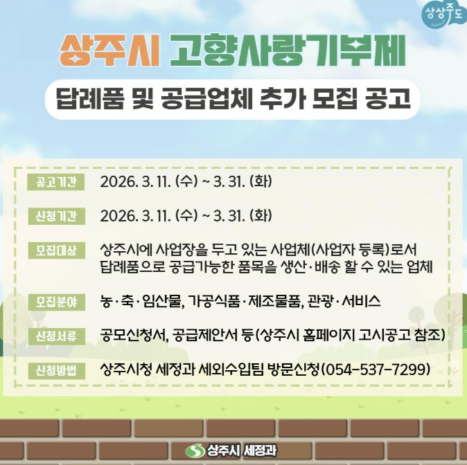[뉴스노크=김인호 기자] 상주시는 고향사랑기부제 활성화와 지역경제 발전을 위해 고향사랑기부제 답례품 및 공급업체를 추가 모집한다.