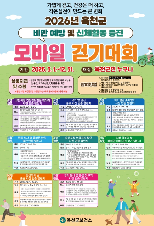 [뉴스노크=김인호 기자] 옥천군보건소는 지역주민의 일상 속 걷기 실천율을 높이고 건강증진을 도모하기 위해 ‘2026년 옥천군 모바일 걷기대회’ 커뮤니티를 운영한다고 밝혔다.