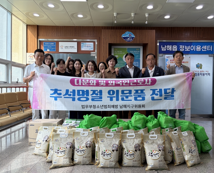 [뉴스노크=김인호 기자] 법무부 청소년범죄예방 남해지구위원회(회장 류근만)는 29일 추석 명절을 맞아 지역 내 다문화 가정 및 외국인근로자에게 전달해 달라며 쌀과 생필품 등을 남해군에 기탁했다.