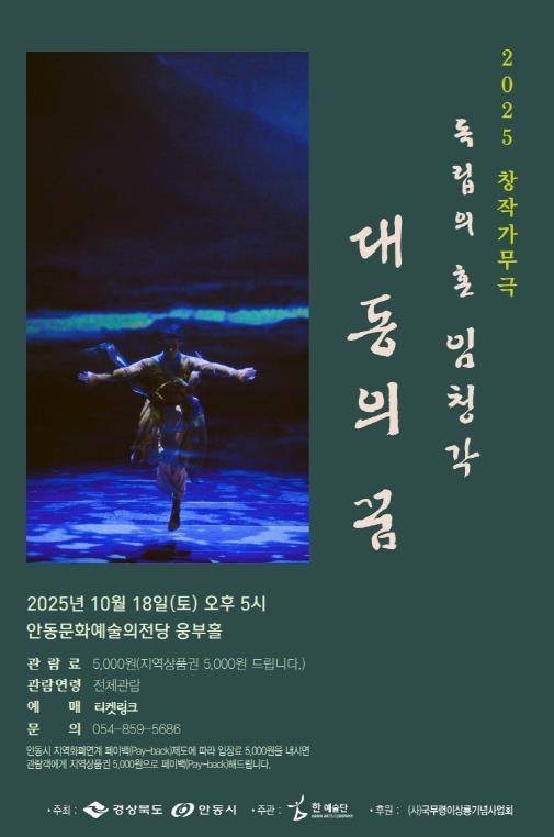[뉴스노크=김인호 기자] 한예술단이 주최․주관하는 '2025 창작가무극 독립의 혼 임청각 ‘대동의 꿈’' 공연이 10월 18일 오후 5시, 안동문화예술의전당 웅부홀에서 개최된다.