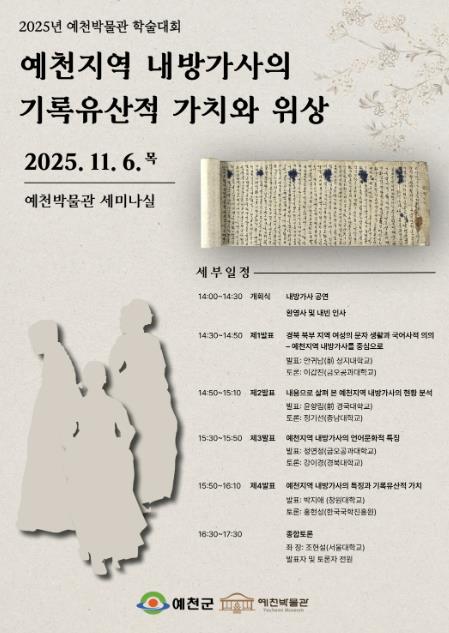 [뉴스노크=김인호 기자] 예천군 예천박물관은 11월 6일 오후 2시 ‘예천지역 내방가사의 기록유산적 가치와 위상’이란 주제로 학술대회를 개최한다.